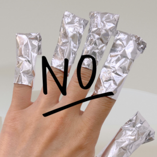 ネイルサロンの多くは、コットンにアセトンという強い溶剤を含ませ爪に乗せ、アルミホイルで巻いて湿布状態に15分程放置します。そして、ネイルをすべて溶かして削り落とす「付け替え」が当たり前。