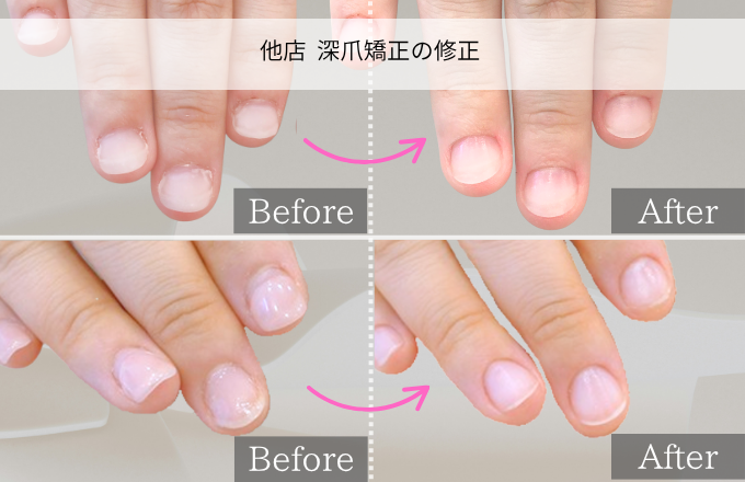 他店での深爪矯正に満足できなかった方からの「他店修正」も多く、より自然で美しい仕上がりを求める方に選ばれています。